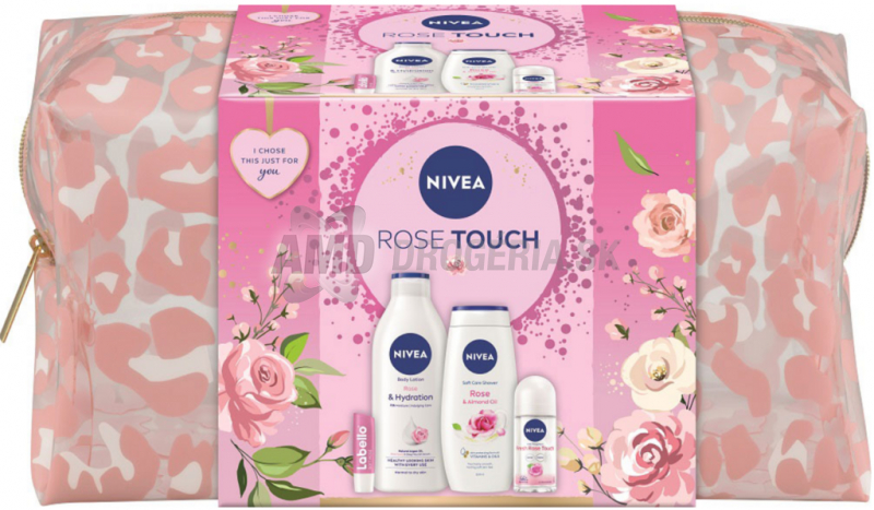 KAZETA NIVEA TAŠKA WOMEN ROSE TOUCH TELOVÉ MLIEKO 400ML + SPRCHOVÝ GÉL 250ML + ROLL ON 50ML + LABELLO 4,8G