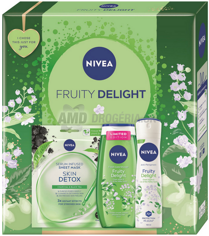 KAZETA NIVEA WOMEN BOX FRUITY DELIGHT DETOXIKAČNÁ TEXTILNÁ MASKA + SPRCHOVÝ GÉL 250ML + ANTIPERSPIRANT 150ML