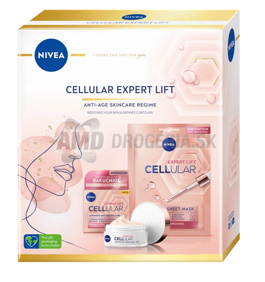 Viete o niekom, kto si robí zbytočne vrásky? Pomôžte mu s ich vyhladením a darujte mu NIVEA darčekový box pre liftingový efekt. Denný krém s čistým bakuchiolom už 4 hodiny po nanesení zvyšuje tvorbu kolagénu v pleťových bunkách a pomáha obnoviť kontúry pleti. Navyše obsahuje mikro a makro kyselinu hyalurónovú, ktorá vyhladzuje a viditeľne redukuje vrásky. A remodelačná kryomaska dodá pleti okamžitý svieži vzhľad a dlhodobú hydratáciu. Súprava obsahuje: Denný krém Cellular Expert Lift OF 30 50 ml Textilná kryomaska Cellular Expert Lift 1 ks