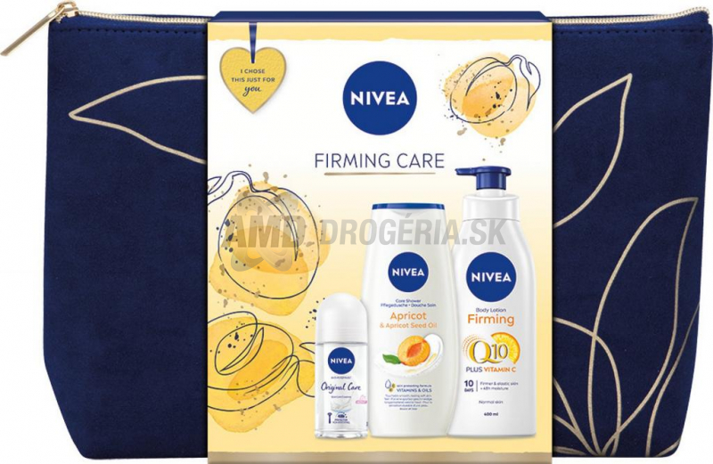 Darčeková taška obsahuje Ošetrujúci sprchový gél Apricot s vitamínmi C, E a vzácnymi olejmi, ktorý zabraňuje vysušovaniu pokožky a zahalí ju do ovocnej vône. Ďalej v taške nájdete spevňujúce telové mlieko s koenzýmom Q10 a vitamínom C, ktoré znateľne zvyšuje pevnosť a pružnosť pokožky už po 10 dňoch a zároveň jej poskytuje dlhodobú hydratáciu. A 48-hodinovú ochranu pred potom a nepríjemným zápachom zaistí guličkový antiperspirant s príjemnou púdrovou vôňou. Súprava obsahuje: Spevňujúce telové mlieko Q10 + Vitamín C 400 ml Ošetrujúci sprchový gél Care & Apricot (Care Shower) 250 ml Guľôčkový antiperspirant Original Care (Antiperspirant) 50 ml Kozmetická taška