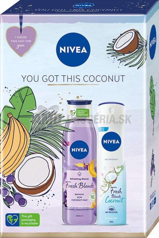 Darčekový box, ktorý obdarovanú prenesie do exotických krajín. Skrátka taká exotická dovolenka uprostred tuhej zimy. Sprchový gél s kokosovým mliekom zanecháva pokožku zamatovo hebkú na dotyk. O jej dlhotrvajúce prevoňanie sa postarajú bobule acai a banán. Zloženie je z 90% prírodného pôvodu a nenarúša prirodzenú mikrobiálnu vrstvu pokožky. A to nie je všetko. Aby exotiky nebolo málo, do boxu sme pridali antiperspirant so sladkou vôňou kokosu, ktorá vydrží celý deň. A pokožka v podpazuší bude na 48 hodín chránená pred potom. Tak doprajte svojim blízkym tento rok na Vianoce cestu do teplých krajín! Súprava obsahuje: Antiperspirant v spreji pre ženy Fresh Coconut 150 ml Sprchový gél Fresh Blends Banana & Acai 300 ml