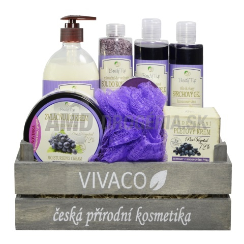 Darčekové balenie kozmetiky s výťažkami z hroznového vína pre každodennú starostlivosť o pokožku a pleť v dekoratívnom drevenom obale. Svieža ovocná vôňa oživuje myseľ a dodáva pocit sviežosti po celý deň.