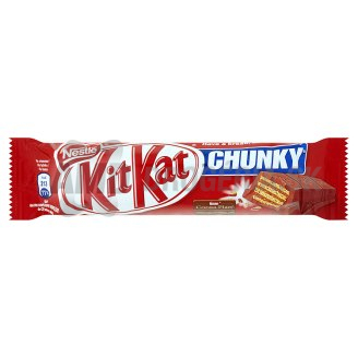 KIT KAT CHUNKY 40 GVychutnajte si pauzu s chrumkavou oblátkou a jemnou náplňou v lahodnej mliečnej čokoláde.zloženie: cukor, pšeničná múka, kakaové maslo, sušené plnotučné mlieko, kakaová hmota, rastlinný tuk, sušená srvátka, maslový tuk, emulgátor (slnečnicový lecitín), arómy, jedlá soľ, kypriaca látka (hydrogénuhličitan sodný).