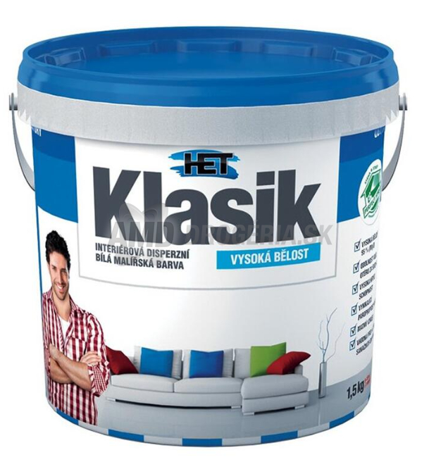 KLASIK BIELY 1.5 KGOdporúčame pre obývacie a komerčné priestory, detské izby, chodby, kancelárie, predajné priestory.Prednosti: vysoká belosť 95% (MgO)výrazná krycia schopnosť matný vzhľadodolnosť voči oteru za suchavýborná paropriepustnosťvhodná na nátery omietok sanačných systémov - spĺňa požiadavky smernice WTA pre povrchové vrstvy sanačných omietok (Sd = 0,05 m Odtieň:biely, tónovanie je možné robiť tónovacími farbami HETCOLOR alebo tónovacími prípravky Kolorka (max. do pomeru 1:5 dielom farby), prípadne miešaním s výrobkom KLASIK COLORVýdatnosť:6 - 10 m2/kg v jednej vrstve podľa nasiakavosti a štruktúry podkladu a hrúbky vrstvyDoba schnutia:najmenej 4 hodiny pri 20 ° C a 60% relatívnej vlhkosti vzduchuSkladovanie:24 mesiacov od dátumu výroby v pôvodnom neotvorenom obalepri teplote +3 až +30 ° C, nesmie zmrznúť, chrániť pred priamym slnečným žiarením Podkladový materiál:omietkymurivodrevovláknité doskydrevotrieskové doskybetónové panelypapiertapety zo sklených vlákiensanačné omietkysadrokartón