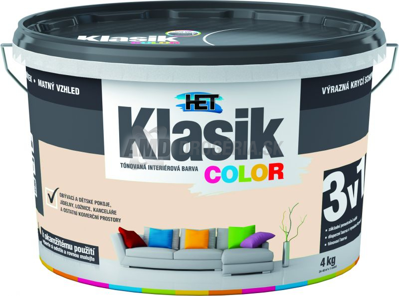 Klasik color - Tónovaná, matná, oteru vzdorná, vysoko paropriepustná, rýchloschnúca, interiérová, disperzná farba s vysokou krycou schopnosťou a rozotierateľnosťou na okamžité použitie, dodávaná v 12 základných farebných odtieňoch.