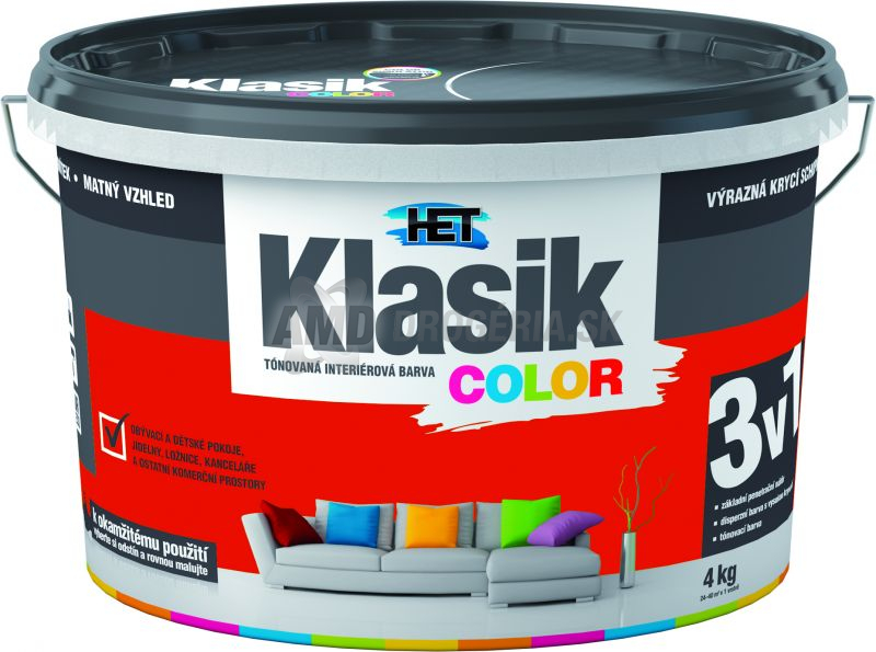 Klasik color - Tónovaná, matná, oteru vzdorná, vysoko paropriepustná, rýchloschnúca, interiérová, disperzná farba s vysokou krycou schopnosťou a rozotierateľnosťou na okamžité použitie, dodávaná v 12 základných farebných odtieňoch.