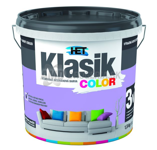 Klasik color - Tónovaná, matná, oteru vzdorná, vysoko paropriepustná, rýchloschnúca, interiérová, disperzná farba s vysokou krycou schopnosťou a rozotierateľnosťou na okamžité použitie, dodávaná v 12 základných farebných odtieňoch.