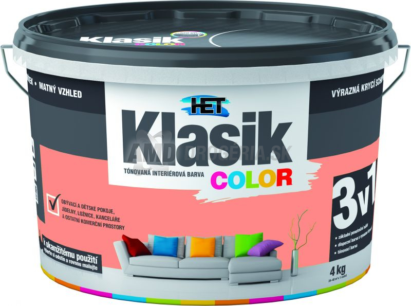 Klasik color - Tónovaná, matná, oteru vzdorná, vysoko paropriepustná, rýchloschnúca, interiérová, disperzná farba s vysokou krycou schopnosťou a rozotierateľnosťou na okamžité použitie, dodávaná v 12 základných farebných odtieňoch.