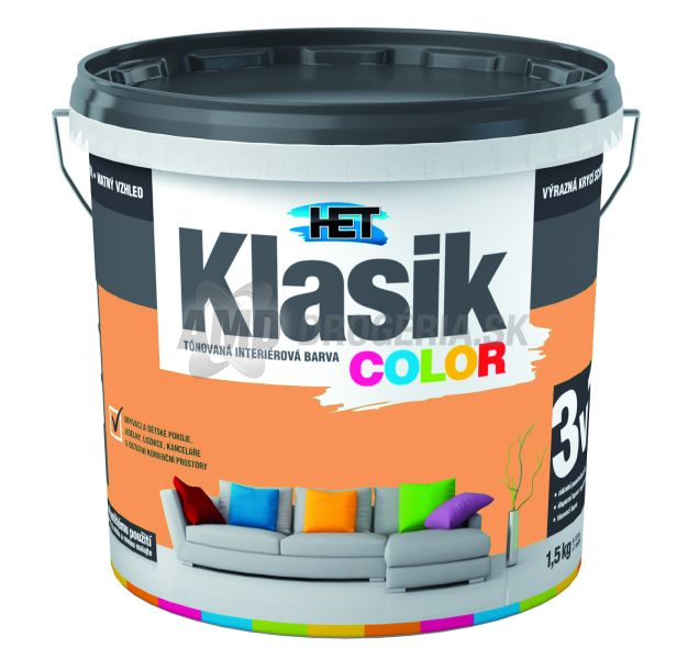 Klasik color - Tónovaná, matná, oteru vzdorná, vysoko paropriepustná, rýchloschnúca, interiérová, disperzná farba s vysokou krycou schopnosťou a rozotierateľnosťou na okamžité použitie, dodávaná v 12 základných farebných odtieňoch.