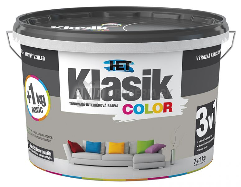 Klasik color - Tónovaná, matná, oteru vzdorná, vysoko paropriepustná, rýchloschnúca, interiérová, disperzná farba s vysokou krycou schopnosťou a rozotierateľnosťou na okamžité použitie, dodávaná v 12 základných farebných odtieňoch.