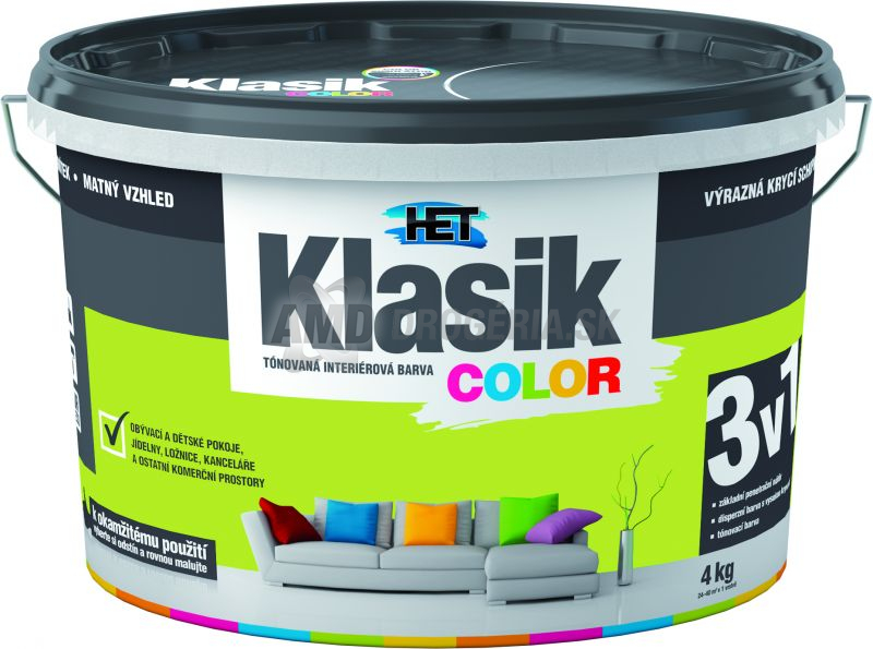 Klasik Color Tónovaná disperzná interiérová farba, odtieň 0597 - svetlo zelená, 1,5kg Klasik Color je tónovaná, matná, oteru vzdorná a vysoko paropriepustná rýchloschnúca interiérová disperzná farba s vysokou krycou schopnosťou a roztierateľnosťou k okamžitému použitiu, dodávaná v 12 základných odtieňoch. Sýtosť odtieňov Klasik Color je možné upraviť pomerným miešaním s bielou interiérovou farbou Klasik. Prednosti: - okamžitá aplikácia tónovanej farby - vynikajúca priedušnosť - odolná voči oteru za sucha - dobrá priľnavosť k minerálnym podkladom - cenová výhodnosť Výdatnosť: 6 - 10 m2 / kg v jednej vrstve Doba schnutia: 2 - 4 h pri 20 °C a 60 % relatívnej vlhkosti vzduchu Spôsob nanášania: štetka, valček, striekanie Balenie: plastové vedrá 1,5 kg, 4 kg, 7 kg