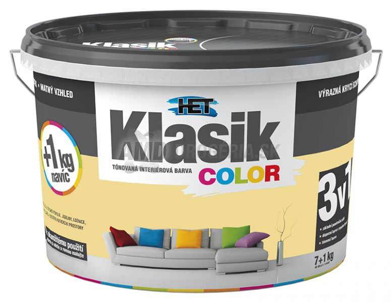 Klasik color - Tónovaná, matná, oteru vzdorná, vysoko paropriepustná, rýchloschnúca, interiérová, disperzná farba s vysokou krycou schopnosťou a rozotierateľnosťou na okamžité použitie, dodávaná v 12 základných farebných odtieňoch.