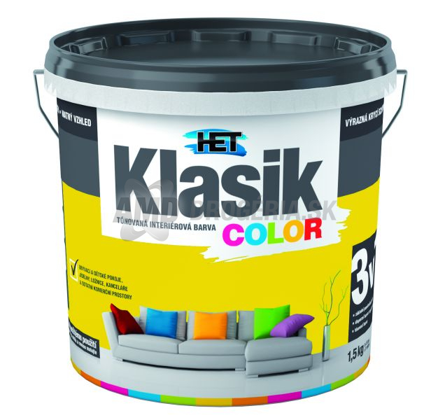 Klasik color - Tónovaná, matná, oteru vzdorná, vysoko paropriepustná, rýchloschnúca, interiérová, disperzná farba s vysokou krycou schopnosťou a rozotierateľnosťou na okamžité použitie, dodávaná v 12 základných farebných odtieňoch.