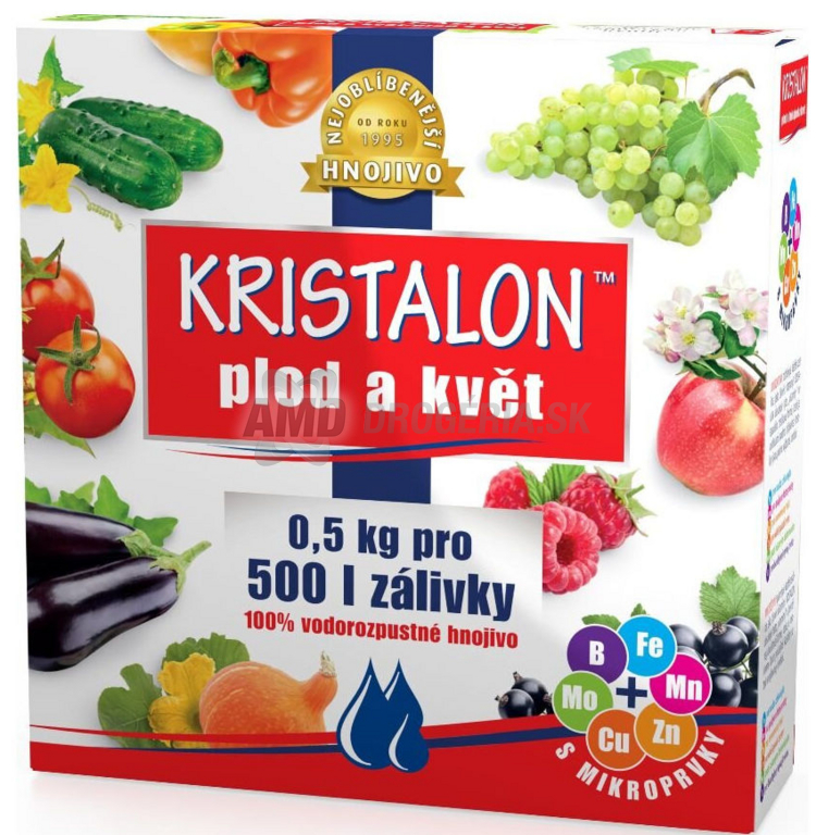 Hnojivo KRISTALON 500g Plod a kvet je kryštalické hnojivo s vlastnosťou vodorozpustnosti, určené na rýchlejší štart produkčného obdobia rastlín. Jeho formula podporuje vyššiu násadu a lepšie vyfarbenie kvetov a plodov. KRISTALON Plod a kvet je vhodný pre široké spektrum rastlín, vrátane ovocia, zeleniny, okrasných rastlín, ako aj balkónových kvetov, ovocných stromov, kríkov a viniča. Okrem toho, že zabraňuje žltnutiu listov, toto hnojivo rýchlo poskytuje účinok a podporuje produkciu rastlín, čo prispieva k ich zdravému a plodnému rastu.