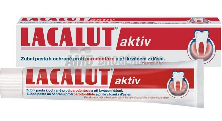 Zubná pasta Lacalut aktiv je prostriedkom, slúžiacim na prevenciu pred paradentózou a má výrazné sťahujúce účinky. Účinnou látkou je alumínium laktát, ktorý vykazuje výrazné adstringentné (sťahujúce) účinky. Posilňuje parodont a zastavuje krvácanie ďasien. Prítomné zložky alantoín a bisabolol zabezpečujú protizápalový účinok. Prítomné fluoridy (1 360 ppm fluóru) spevňujú zubnú sklovinu a chráni ju pred vznikom zubného kazu. Obsiahnutý chlórhexidín, najúčinnejšia látka v boji proti zubnému plaku, rozrušuje zubný povlak a zabraňuje jeho spätnému usadzovaniu na sklovine. Účinnosť zubnej pasty zvyšuje Lacalut aktiv ústna voda a Lacalut aktiv zubnú kefku.
