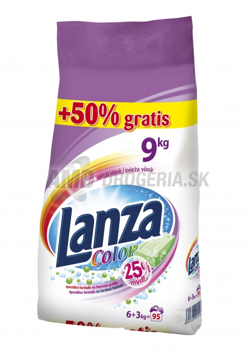 K praciemu prášku Lanza Color 6 kg dostanete zadarmo 50% navyše. S Lanza Color pocítite skutočnú silu pracieho prášku hlavne na farebnom prádle. Obsahuje zelené mydlové vločky z Lanza mydla, ktoré prenikajú hlboko do škvŕn a uvoľňujú špinu z vlákien oblečenia. Lanza Color je v eľmi šetrná k farbám. Výsledkom prania s týmto Lanza prostriedkom sú jasné, žiariace farby a čisté prádlo. Prášok účinkuje pri všetkých teplotách.