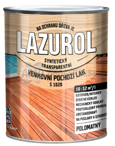 LAZUROL S1020 je syntetický lak modifikovaný polyuretánom, na vonkajšie použitie (napr. na drevenú dlážku). Podklad: drevo, drevotrieska, korok.