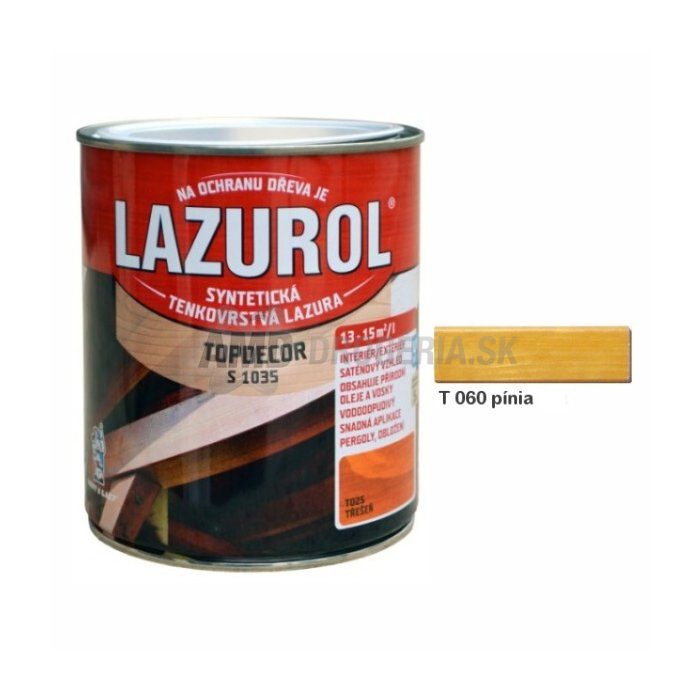 LAZUROL TOPDECOR Tenkovrstvá syntetická lazúra zo zmesou voskov a olejov na drevo S1035 je určený k ochranným lazúrovacím náterom mäkkého a tvrdého dreva (drevo, drevotrieska, korok), vystaveného poveternostným vplyvom i k náterom v interiéroch. Používa sa v interiéroch aj v exteriéroch (s vynimkou prírodného bezfarebného odtieňa) na záhradný nábytok, drevené štíty, podhľady, obloženie stien a stropov, ploty, chaty a drevené domčeky, okná, dvere, korok, penetrácia drevených podláh. Hlboko preniká do štruktúry dreva a zvýrazňuje kresbu dreva.