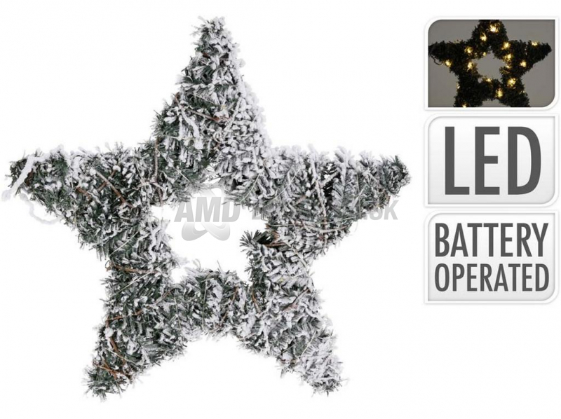 Zasnežená hviezda s ľad diódami s teplým žltým svetlom umocní vianočnú atmosféru a zútulní Váš domov. Hviezda je vyrobená z umelého ihličia, pretkaná umelým ratanom, zasnežená a omotaná tenkými ľad svetielkami. Veľkosť hviezdy je 40cm.