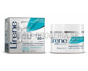 LIRENE REGENERAČNÝ KRÉM DENNÝ TVÁR- KRK 50 GKozmetická rada folacínu ActiveTM od Lirene bola vytvorená pre ženy nad 30 rokov. Inovačné komplex FoliMoistTM (100% aktívna kyselina listová + aktivátory hydratácia) stimuluje delenie buniek tým, že aktivuje výrobu nových kožných buniek a uľahčuje ich rast. Navyše napráva poškodenia spôsobené negatívnymi faktormi z okolia vrátane UV radiácie - predlžuje život nových kožných buniek a pokožka tak vyzerá mladšie. Vďaka formule pre aktívnu stimuláciu sú aktivované procesy obnovy pokožky, ktoré sa spomaľujú s pribúdajúcim vekom a tým dochádza k efektívnej regenerácii pokožky.Krém je určený pre pokožku, ktorá vykazuje prvé známky starnutia. Pokožku ovplyvňujú škodlivé vplyvy z okolia a život v strese, čo vedie k zníženiu hydratácia, pokožka stráca svoju elasticitu a vyzerá unavene. Vďaka formule pre aktívnu stimuláciu krém stimuluje výrobu a rast nových kožných buniek a tým efektívne oživuje a regeneruje pokožku. Hojnosť efektívnych aktívnych zložiek zaisťuje intenzívnu hydratáciu, posilňuje a zjemňuje pokožku. Koža v oblasti tváre a krku sa stáva elastickejšie, pevnejšia a viditeľne mladšia.Účinné látky:Komplex FoliMoist ™ (100% aktívna kyselina listová + aktivátory hydratácia) napráva poškodenia vzniknuté negatívnym vplyvom z okolia a výrazne predlžuje život kožných buniek.Kyselina hyalurónová + fyto-kolagén obnovujú v pokožke prirodzenú rovnováhu vody.Bambucké maslo zabraňuje strate hydratácie v pokožke a hydratuje ju tak až po 24 hodín.Mandľový olej pokožku intenzívne zjemňuje a navracia ju elasticitu.