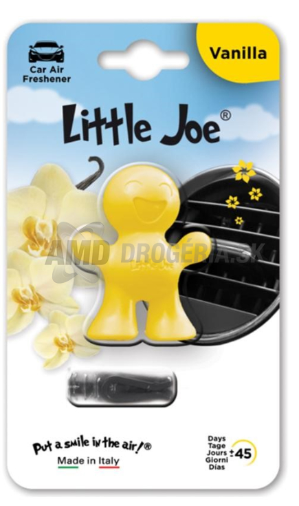 Doprajte svojmu autu príjemnú a dlhotrvajúcu vôňu s Little Joe 3D Vanilla – originálnym osviežovačom vzduchu v podobe veselej plastovej postavičky, ktorú jednoducho pripevníte do mriežky ventilátora. Tento štýlový doplnok nielen prevonia interiér sladkou vanilkovou arómou, ale zároveň oživí vzhľad vášho auta.