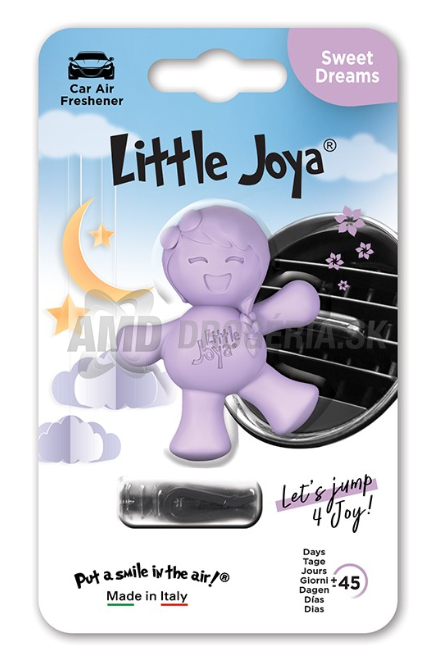 Doprajte svojmu autu alebo domácnosti výnimočnú atmosféru s Little Joya Sweet Dreams – originálnym osviežovačom vzduchu v podobe veselej postavičky Joya, ktorú jednoducho upevníte do mriežky ventilátora.