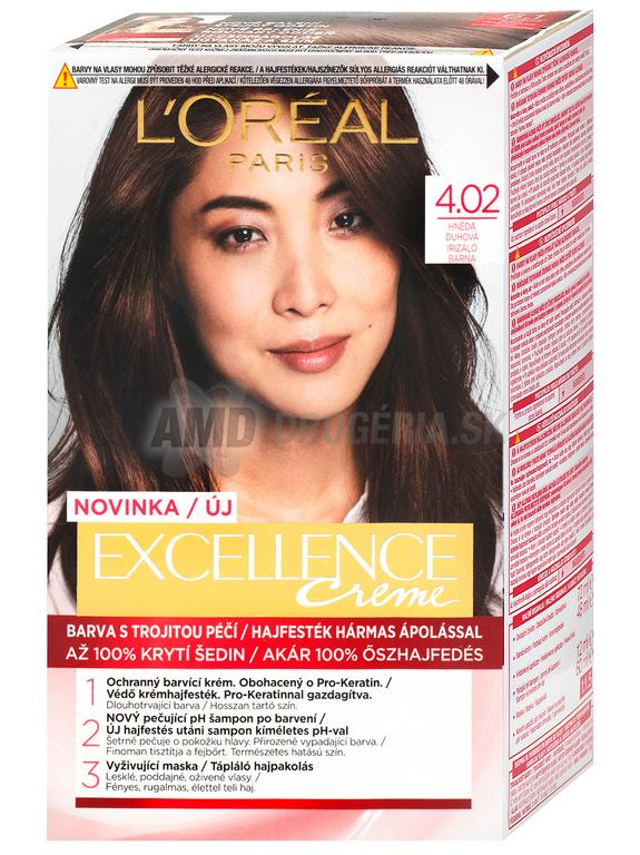 L’Oréal Paris Excellence Creme farba na vlasy, 4.02 hnedá dúhová prináša prirodzene vyzerajúcu, jasnú a intenzívnu farbu na vlasy. Zloženie s Pro-Keratínom a Ceramidom chráni vlasové vlákna počas farbenia, zatiaľ čo záverečná starostlivosť ich obnovuje a posilňuje. Farba na vlasy L’Oréal Paris Excellence Creme spoľahlivo prekryje aj veľmi šedivé vlasy a vy tak získate intenzívnu a dlhotrvajúcu farbu s brilantným leskom. Pre nádherné hnedé odtiene bez šedín!