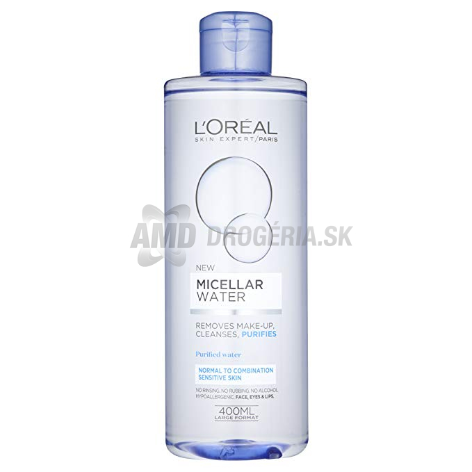 L´OREAL Micellar Water, micelárna voda - normálna až zmiešaná, citlivá pleť. Odstraňuje make-up z tváre, očí a pier v jedinom jemnom kroku bez drhnutia a oplachovania. Čistí: Jemne zachytáva nečistoty. Upokojuje: Odstraňuje prebytočný kožný maz a zmatňuje mastnú a lesknúcu sa pleť.