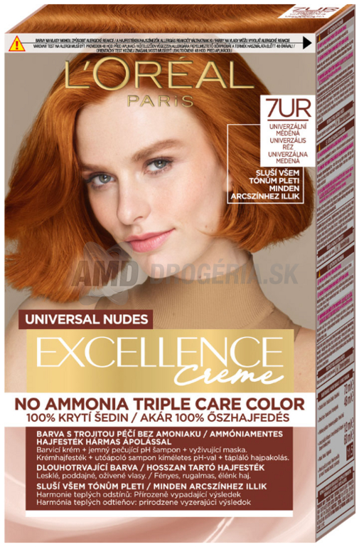 L'Oréal Paris Excellence Nudes Copper 7UR je intenzívna permanentná farba bez amoniaku, obohatená o ochranné zložky. Tento produkt ponúka rituál farbenia s trojitou ochranou, ktorý sa stará o farbu, pokožku hlavy aj vlasy. Nový jemný ošetrujúci pH šampón po farbení zanecháva vlasy hladké, plné lesku a s prirodzene vyzerajúcou farbou. Farba kryje až 100 % šedín.