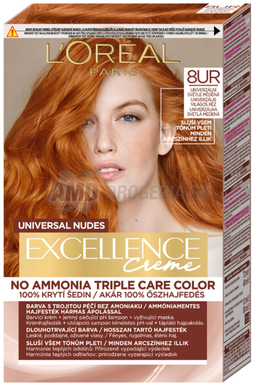 L'Oréal Paris Excellence Nudes Copper 8UR je intenzívna permanentná farba bez amoniaku, obohatená o ochranné zložky. Tento produkt ponúka rituál farbenia s trojitou ochranou, ktorý sa stará o farbu, pokožku hlavy aj vlasy. Nový jemný ošetrujúci pH šampón po farbení zanecháva vlasy hladké, plné lesku a s prirodzene vyzerajúcou farbou. Farba kryje až 100 % šedín.