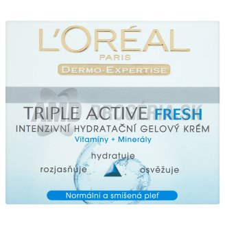 LOREAL TRIPLE ACTIVE FRESH PNM KRÉM 50 ML L´ORÉAL Derma Triple Active Fresh Intenzívny hydratačný denný krém gelovej konzistencie, pre normálnu až zmiešanú pleť 50ml Denný intenzívny hydratačný gélový krém pre normálnu a zmiešanú pleť. Je obohatený o vitamíny a minerály a dodáva pleti svieži vzhľad, jemnosť na dotyk a dokonalú hydratáciu. Jemné gelové zloženie zaručí dokonalé rozotrenie a nezanecháva mastný film. Dokonalé na horúce letné dni. Aplikácia: Nanášajte ráno na dobre očistenú pleť.