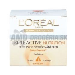 LOREAL TRIPLE ACTIVE KRÉM 50 ML Suchá pleť trpí nedostatkom lipidov, čo znižuje jej pružnosť a pocit komfortu, stáva sa citlivejšou voči nepriaznivým vplyvom akými sú napríklad vietor, chlad a klimatizácia.účinky:napomáha hydratovať pokožku až po dobu 24 hodín,obnovuje prirodzenú ochrannú bariéru pleti a chráni pleť vďaka UVB filtra,pleť vyživuje vďaka omega 3 a 6 mastné kyseliny.výsledky:Pleť je hydratovaná a zbavená pocitu vysušenia a pnutia, ďalej je pleť vyživená, upokojená a je chránená pred nepriaznivými vplyvmi prostredia. Pravidelným používaním získava pleť kvalitu normálnej pleti.