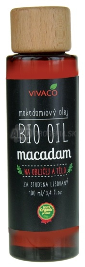 BIO Makadamový olej sa získava z makadamových orechov a je bohatý na mastné kyseliny. Olej z nich je lisovaný za studena a výborne sa vstrebáva do pokožky. Obsahuje vitamíny A, B a E, má prirodzený SPF faktor. Tento olej má na pokožku silný vyhladzujúci efekt a tým zbavuje pleť vrások. Používa sa na suchý typ pleti, popraskanú, preťaženú a popálenú pokožku. Hlavným efektom makadamového oleja je schopnosť okamžite a dlhodobo hydratovať, hojiť a regenerovať. Môžete ho použiť i na vlasy ako zábal.
