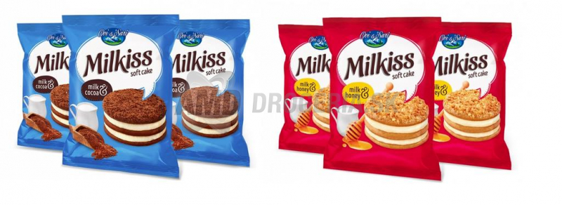 Medový koláč s mliečnym krémom. Zloženie: Krém 53%: cukor, voda, suš.odstredené mlieko, rafinované rast. tuky a oleje (palmový a slnečnicový olej v prírodných a hydrogenovaných formách, voda, soľ, emulgátory: mono - a diglyceridy mastných kyselín, leci- tín, kys.citrónová, aróma maslová, farbivo: beta karotén ), stabilizátory: karbo xymetylcelulóza sodná, guarová guma, konzer.látka: sorbat draselný, : Cesto 47%: pš.múka, cukor, vajcia, hydrogen.palmový tuk, včelí med 2%, glukózo-fruktózový sirup, jablk.ocot, hydrogénuhličitan sodný, zvlhčovač: glycerín, konzervačná látka: propionát vápenatý, chuť: maslo, kyselina citrónová.