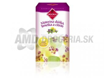 MISTRAL ČAJ MATERINA DÚŠKA, LIMETKA, CITRÓN 30 GNovinka Herbal Balance, to je unikátny Čajová rada, ktorá v sebe ukrýva čaro bylín a lahodnosť ovocia. Vnikla tak dokonalá vyvážená harmónia.účinné látky- materina dúška- citrónová tráva- mäta pieporná- ostružinaOsviežujúci lahodný čaj s ručne zbieranie materinou dúškou, ochutený šťavnatým citrónom a limetkou. Čaj je spracovaný špičkovou technológiou, vďaka čomu si zachováva svoju prirodzenú chuť a napomáha udržiavať telo a myseľ v dokonalej harmónii. Relaxujte s čajom Herbal Balance - jeho kombinácia bylín a ovocia vo Vás určite prebudí zmyselnosť.Na jednu šálku použite vždy nové vrecúško čaju. Zalejte vriacou vodou. Pre získanie kvalitného nápoja s jemnou chuťou odporúčame lúhovať 5 minút.