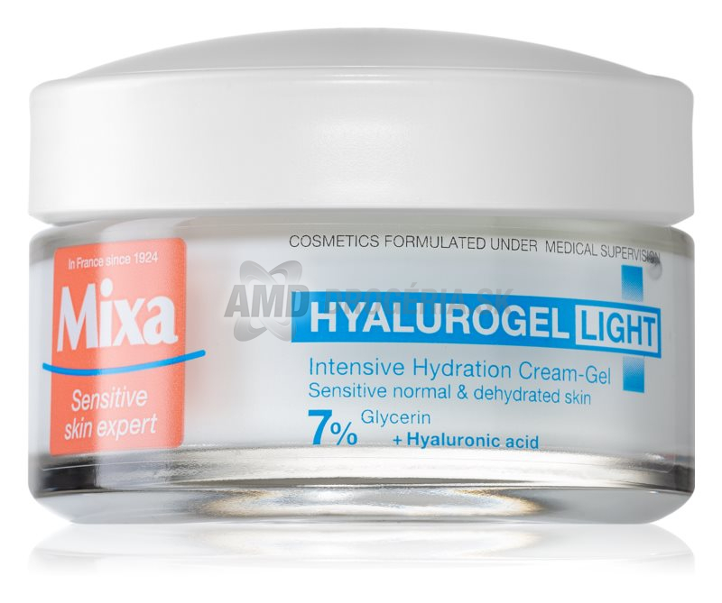 Mixa Sensitive Skin Expert intenzívna hydratačná starostlivosť Hyalurogel Light vďaka svojej jedinečnej gélovej textúre s obsahom kyseliny hyalurónovej a glycerínu pomáha uchovať prirodzený obsah vody v pokožke a prispieva tak k zvýšeniu jej hydratácie. Zároveň chráni ju pred vysušením. Citlivá pleť so sklonom k dehydratácii získa vláčnosť, pocit úľavy a zdravý vzhľad. Mixa Sensitive Skin Expert intenzívnej hydratačná starostlivosť pôsobí po celý deň a znižuje riziko vzniku alergií.