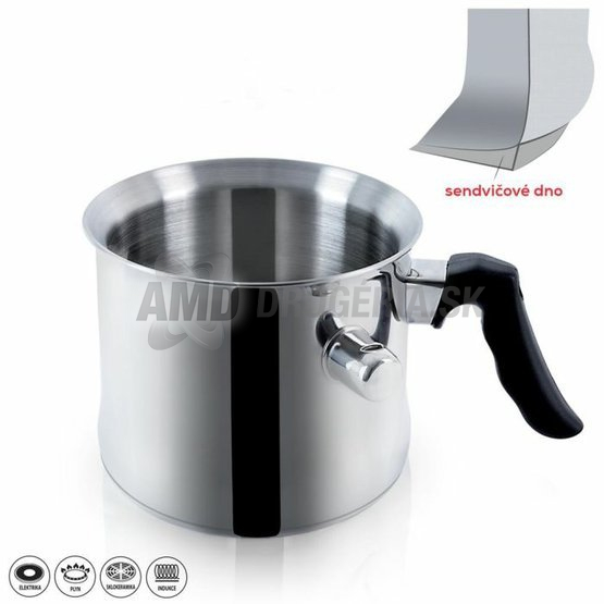 Mliekovar bez pokrievky z kvalitnej nerez ocele má dvojitú stenu nádoby, do ktorej lejeme vodu, aby zabránila pripálenia mlieka i rôznych omáčok, pudingov. Iste oceníte tvarované plastové držadlo Mliekovar. Pískanie píšťalky zabudované v boku hrnca upozorní na kypění mlieka. Možno použiť na elektrickom aj plynovom sporáku, sklokeramickej doske aj indukciu. Sendvičové dno zaistí rovnomerný rozvod tepla, skvele priľne k doske spotrebiča, čo je dôležité predovšetkým u varenia na indukciu.
