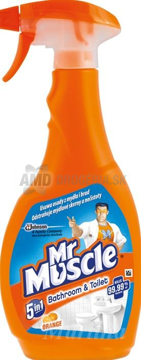 MR.MUSCLE vďaka svojmu päťnásobnému účinku dezinfikuje a čistí všetky materiály a plochy a ničí 99,99% baktérií a vírusov. Účinne, dôkladne a bez veľkej námahy odstraňuje nečistoty, škvrny od mydla v kúpeľni (vane, umývadlá, obkladačky, sanitárne zariadenia, sedátka WC). Zanecháva príjemnú vôňu pomaranča.