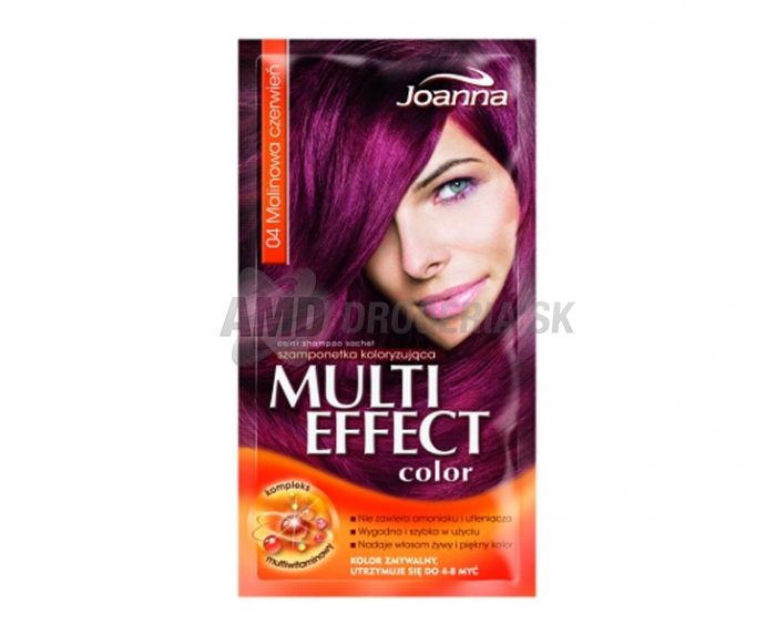 MULTI EFFECT COLOR- 04Séria farbiacich šampónov MULTI COLOR effect je určená na rýchle a jednoduché dosiahnutie žiarivých farebných odtieňov. Jemné zloženie preparátu neobsahuje amoniak ani peroxid vodíka, preto je k vlasom veľmi šetrný.Navyše multivitamínový komplex vlasy hydratuje a vyživuje. Po použití šampónu získajú vlasy peknú a živú farbu, ktorá vydrží 4 – 8 umytí.