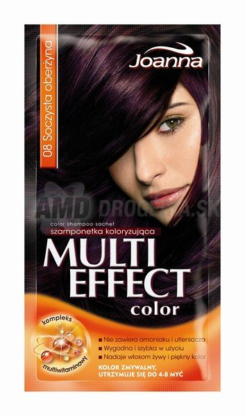 MULTI EFFECT COLOR- 08Séria farbiacich šampónov MULTI COLOR effect je určená na rýchle a jednoduché dosiahnutie žiarivých farebných odtieňov. Jemné zloženie preparátu neobsahuje amoniak ani peroxid vodíka, preto je k vlasom veľmi šetrný.Navyše multivitamínový komplex vlasy hydratuje a vyživuje. Po použití šampónu získajú vlasy peknú a živú farbu, ktorá vydrží 4 – 8 umytí.