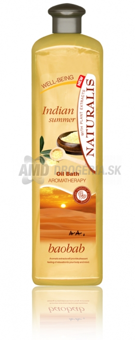 NATURALIS PENA DO KÚPEĽA INDIAN SUMMER 1 LRelaxačné olejová kúpeľ s intenzívnou vôňou baobabu prispieva k prekrveniu a príjemnému odpočinku. Obsiahnuté extrakty blahodárne pôsobí na uvoľnenie tela a mysle.Špeciálna kombinácia pôsobiacich látok zvláčňuje pokožku a zabraňuje jej vysychaniu.