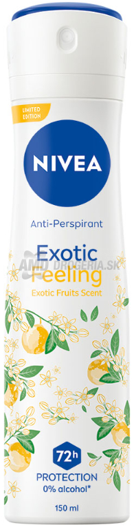 Zažite spoľahlivú 72-hodinovú ochranu proti poteniu a starostlivosť o pokožku podpazušia s osviežujúcou vôňou exotického ovocia s antiperspirantom Nivea Exotic Feeling.
