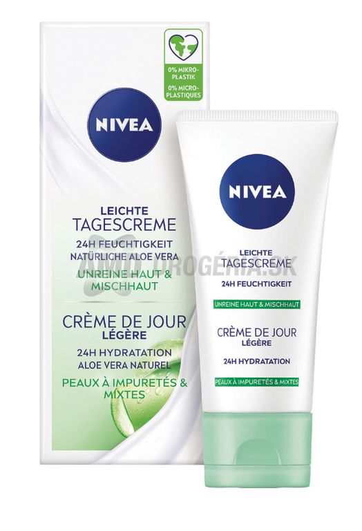 Zmatňujúci denný krém je skvelým doplnkom vašej každodennej starostlivosti o zmiešanú pleť so sklonom k masteniu. Jeho intenzívna hydratácia na 24 hodín pomáha poskytovať až prirodzenú úroveň hydratácie pokožky. S ľahkým zložením obsahujúcim komplex NIVEA® Moisture Care, prírodné aloe vera a minerály redukujú produkciu kožného mazu a znižujú lesk pokožky. Okrem toho sa krém rýchlo vstrebáva, čo znamená, že nezanecháva mastný pocit na koži. Po použití si budete všímať a pocítiť rozdiel. Vaša pleť bude dlhodobo hydratovaná a matnejší každý deň. Tento produkt bol dermatologicky testovaný a je vhodný pre všetky typy pleti. Jeho zloženie je vegánske, žiadne zložky živočíšneho pôvodu. Pre skvelú starostlivosť o zmiešanú pleť odporúčame Zmatniť denný krém pre zmiešanú pleť.