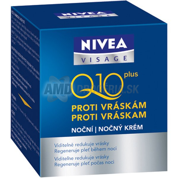 NIVEA KRÉM Q10 NOČNÝ 81289- 50 ML Q10 a kreatín sú vysoko účinné látky, ktoré sa prirodzene nachádzajú vo Vašej pleti. S pribúdajúcim vekom sa ich množstvo znižuje, čo spôsobuje úbytok energie pre ďalšiu regeneráciu pleti.NIVEA Q10 plus rad obsahuje účinné zloženie pleti vlastného koenzýmu Q10 a kreatínu, ktoré pôsobí efektívne proti vráskam a zároveň v harmónii s Vašou pleťou.NIVEA VISAGE Nočný krém proti vráskam Q10 plus viditeľne redukuje vrásky a regeneruje počas noci, kedy je pleť najviac pripravená prijímať hydratáciu.Účinky a vlastnosti: Poskytuje pleti intenzívnu hydratáciu počas noci. Efektívne bojuje proti vráskam zvnútra. Zvyšuje obsah pleti vlastného koenzýmu Q10 a kreatínu počas noci.Použitie:Nanášajte každý večer na starostlivo vyčistenú pleť. Aplikujte malé množstvo krému na tvár, krk a dekolt a krúživými pohybmijemne vmasírujte smerom nahor. Vynechajte citlivú oblasť okolo očí.