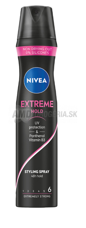 Poznáte to: konečne sa vám podarí vytvoriť požadovaný účes a ledva vykročíte z domova, zaútočí naň prvý vánok a je po paráde. Už nikdy viac! Váš nový bodyguard v podobe laku na vlasy Extreme Hold udrží každý vlások na svojom mieste. Extrémnu fixáciu vydrží až po dobu 48 hodín. V jeho zložení ale nenájdete žiadne škodlivé silikóny. Naopak, je obohacené o panthenol, vitamín B3 a makadamiovú esenciu, takže vlasy zbytočne nevysušuje ani nezaťažuje. Navyše vlasom dodá UV ochranu! Vybavte sa aj vy silným pomocníkom a užite si dlhotrvajúci účes: NIVEA Lak na vlasy Extreme Hold.