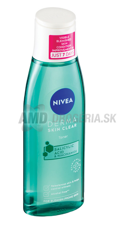 Nivea Čistiaca pleťová voda Derma Skin Clear pre pleť so sklonom k nedokonalostiam s kyselinou salicylovou a niacínamidom.1. Obnovuje rovnováhu pleti.2. Pomáha redukovať mastnotu.3. Hydratuje pleť, neupcháva póry.