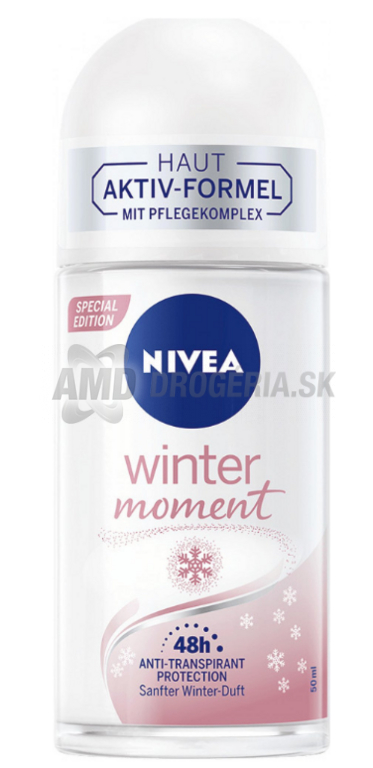 Nivea Winter Moment roll-on 50 ml je špeciálna edícia s jemnou zimnou vôňou, ktorá poskytuje dlhodobú 48-hodinovú ochranu pred potením a silným nepríjemným zápachom. Je vhodný aj pre takú pokožku, pomáha jej stať sa zamatovou jemnou. Obsahuje 0% alkoholu.