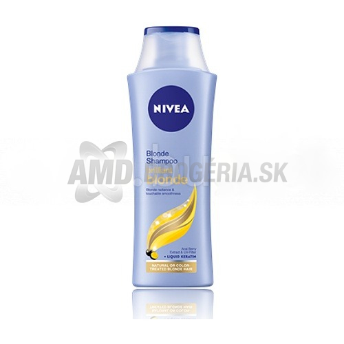 NIVEA ŠAMPÓN BLOND 250 MLNIVEA Šampón pre blond vlasy Brilliant Blonde je určený pre farbené a prirodzene blond vlasy, ktoré rozžiari blond farbu Vašich vlasov a premení ich na oslňujúcu záplavu zlatého lesku. Zloženie s výťažkami z palmy acai, UV filtrom a tekutým keratínom hydratuje vysušené časti vlasov a dodáva im žiarivosť a lesk. Počas umývania vlasy intenzívne ošetruje a hydratuje ich. UV filter chráni pred nepriaznivými vonkajšími vplyvmi. Zvýrazní žiarivosť a lesk blond farby. Uhladzuje povrch vlasov a navracia im hebkosť.