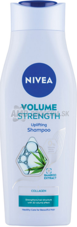 NIVEA ŠAMPÓN VOLUME 400 MLNIVEA Šampón pre zväčšenie objemu Volume Sensation – pre splihnuté, jemné vlasy bez objemu, dodá vlasom viditeľne bohatší objem už od korienkov.Okrem ošetrujúcich zložiek naviac obsahuje Sytle Infusion Systém so stylingovými polymérmi, ktoré vlasy posilňujú a sú základom pre viditeľný nárast objemu vlasov.Vlasy sú po umytí ľahké a lesklé a pripravené na ďalšiu starostlivosť i styling.Dodá vlasom impozantný objem.Dlhodobo vytvorí objemný a bohatý účes.Vlasy zostanú ľahké a nezaťažené.Obsahuje NIVEA BIOSOFT SYSTEM pre neodolateľne hebké a krásne vlasy.