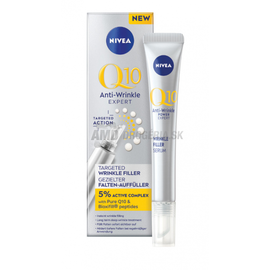 Nivea® Expertná starostlivosť na vyplnenie vrások Q10 Preukázateľne účinná proti hlbokým vráskam.Za 5 minút: Jemné linky a vrásky sú okamžite menej viditeľné vďaka vytvoreniu hydratačného filmu na povrchu pleti. Pleť je pevnejšia a jemnejšia na dotyk.5 % aktívny komplex s čistým koenzýmom Q10, Bioxifill® peptidmi a aktívnymi látkami na omladenie pleti, preniká do pleti*, kde stimuluje produkciu kolagénu a pomáha bojovať proti nepoddajným vráskam zvnútra.***v horných epidermálnych vrstvách.**test in vitro.
